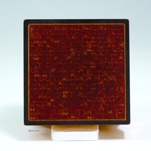 それらを 9 ㎝の角印に彫刻すると、1 文字はミクロサイズ。おそらく、完成した作品を肉眼で見ても、1 文字 1 文字 を読むことはできないほどになるでしょう。これほど小さな文字を 506 文字もハンコとして彫刻するのは、これまでのハンコ業界でも例がないかもし れないほど、難しい挑戦です。ミクロレベルで精密に彫刻する高度な技術が欠かせないのはもちろん、失敗のゆるされない作業を長期間にわたっ ておこなう精神力も必要となります。